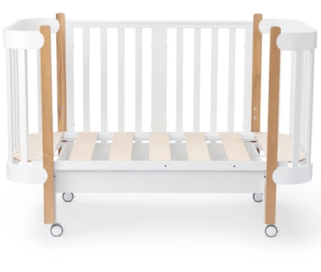 Многофункциональная кроватка без острых углов. Съёмная передняя стенка регулируется по высоте и позволяет использовать кроватку как приставную. Дно устанавливается в 3 положениях для безопасности и удобства. Размер спального места 120×60 см. Первая комплектация поставляется на ножках, обеспечивая стабильность и комфорт для малыша.